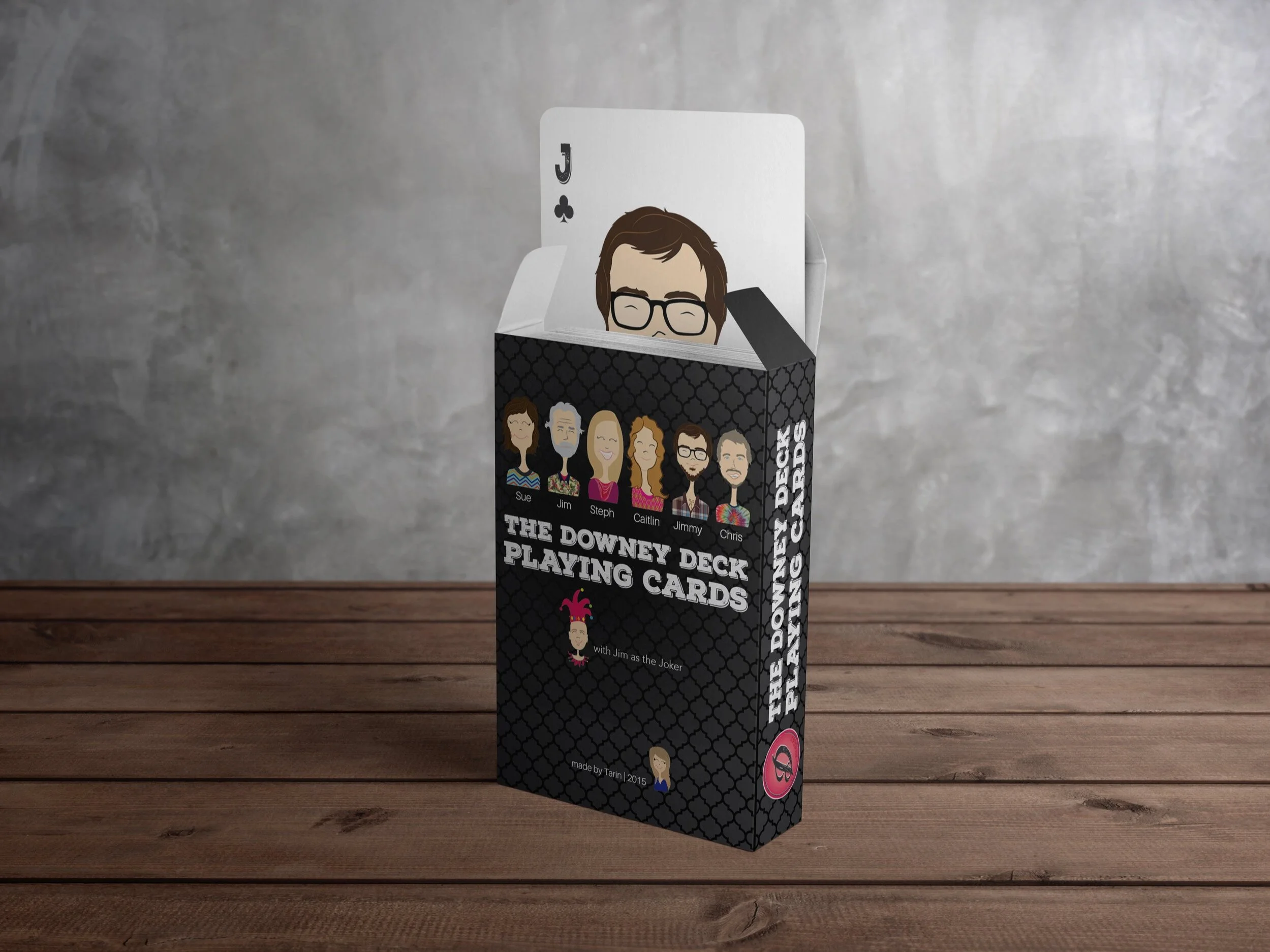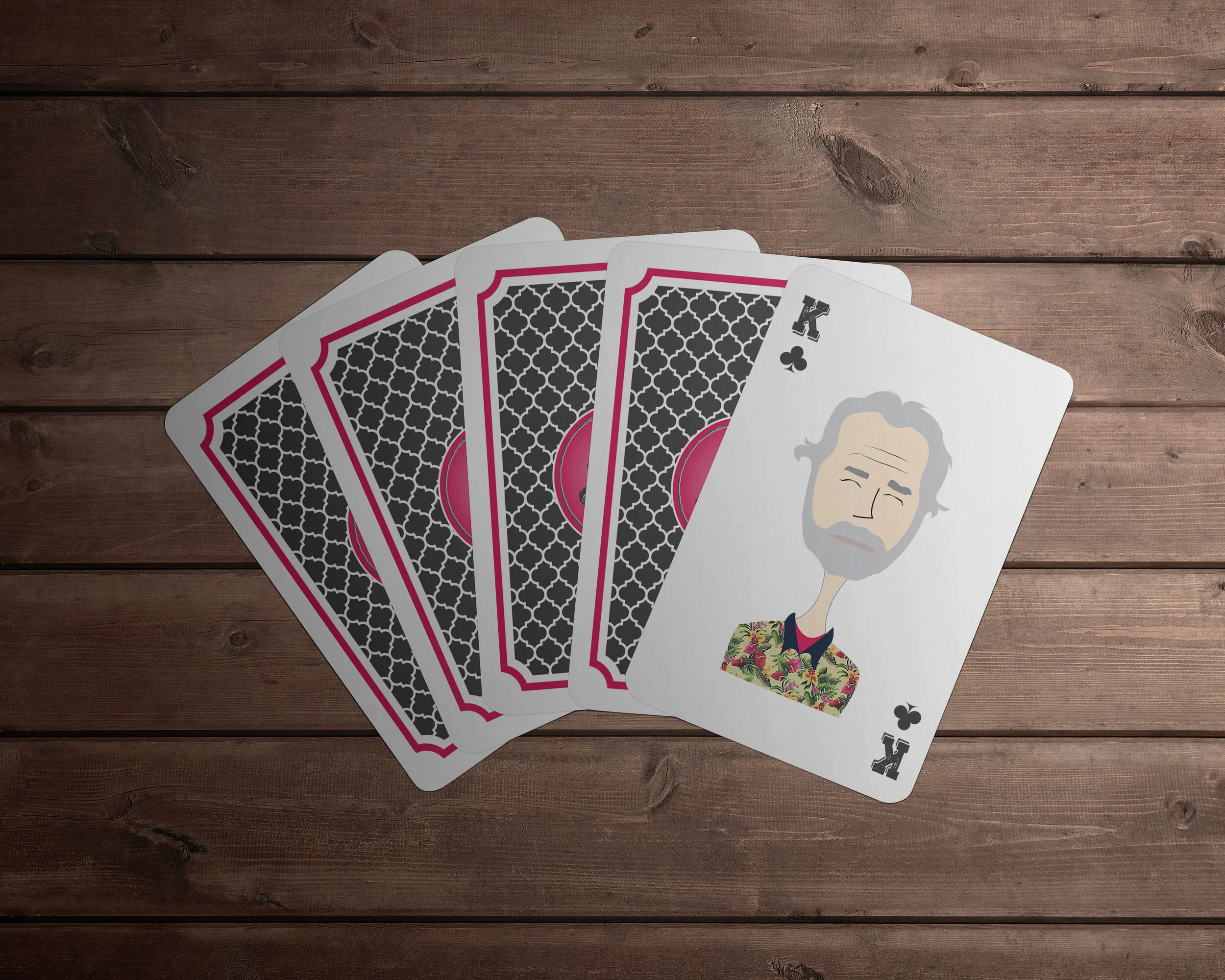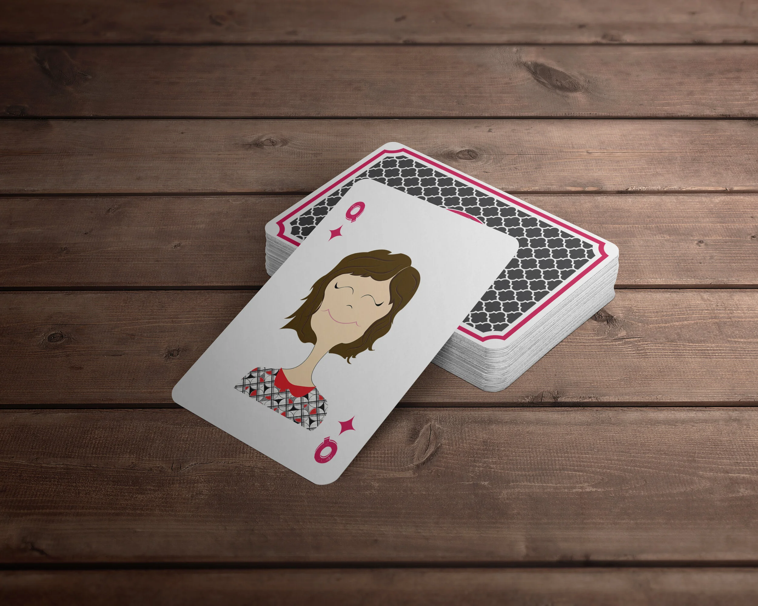 Custom Designed as a one-of-a-kind gift for a family who loves playing cards, this custom deck turned each member into part of the game. Dad became the King, Mom the Queen, each of the four kids a Jack, and the son-in-law the Joker. I illustrated all the suits, face cards, and the patterned back design to create a cohesive, personal, and playful set they could truly call their own.